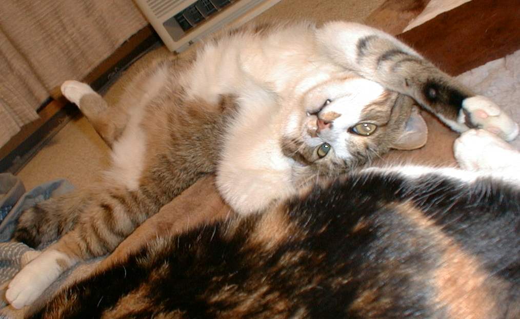 手前は当主のギュウちゃん。ただでさえフクに追いまわされているのに、うるさいのがもう一匹増えてしまって迷惑顔(たぶん?)。